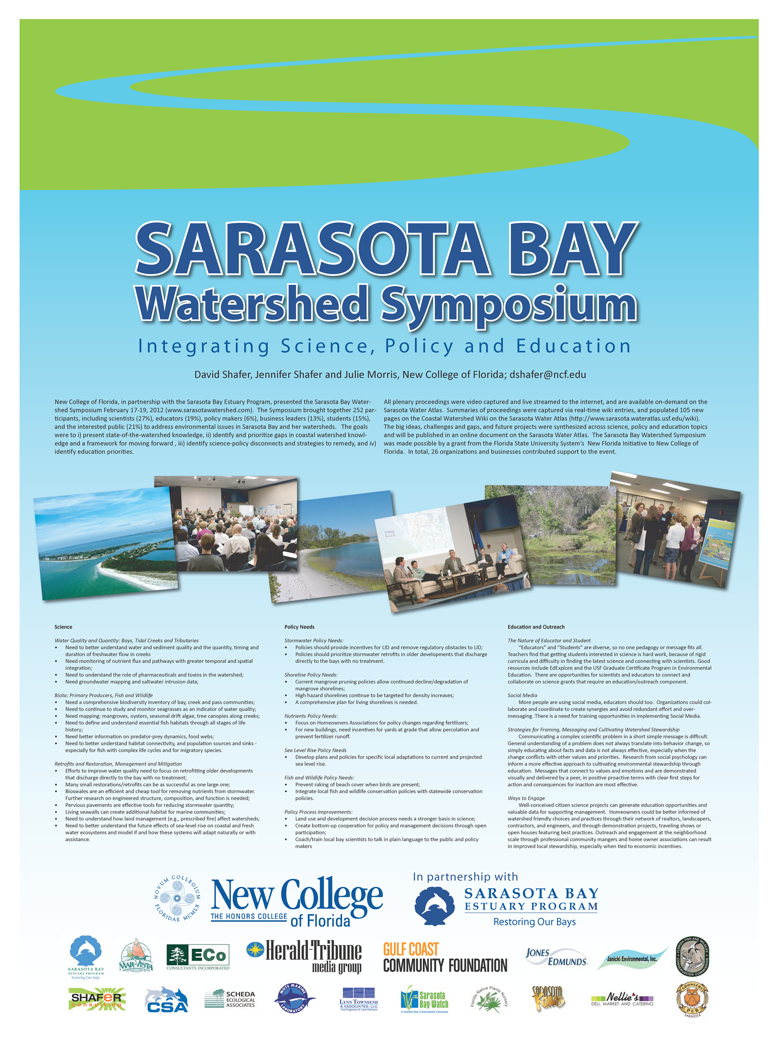 Presented by New College of Florida in partnership with the Sarasota Bay Estuary Program,  the symposium featured keynote speaker Cynthia Barnett and was attended by 250+ scientist, managers, policy-makers, business leaders and interested public.  The Symposium proceedings are archived on the Sarasota County Water Atlas Coastal Watersheds Wiki, created for the event.