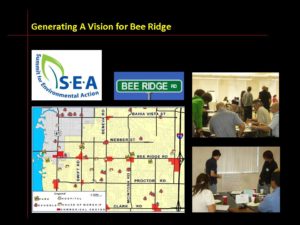 Jennifer Shafer recently presented the final report of the Transportation and Redevelopment Action Committee (TRAC) to the Sarasota County Commission. Tim Dutton, Executive Director of the sponsoring organization SCOPE, praised Jennifer’s leadership: “Dr. Shafer stepped up as both a citizen and as a gifted professional to lead an innovative process of civic engagement. As chair of the citizen group, Jennifer was called upon to convey complex ideas generated through the many steps of the year-long process. Her understanding of the dynamics of development and the nuances of power and personality in the context of citizen ownership made a big difference.” TRAC chose Bee Ridge Road as a case-study for transforming Sarasota’s tired and sprawling corridors using TOD principles to achieve walkable mixed-use neighborhoods connected by multi-modal transit. By distilling hundreds of ideas contributed by citizens participating in Focus Groups, TRAC identified 21 guiding principles to serve as a road map for elected officials, county planners, businesses and neighborhoods. Link to video – Agenda Item 11